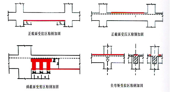 利用專用結(jié)構(gòu)膠將處理后的鋼板粘貼在需要加固的混凝土構(gòu)件表面,使鋼板與混凝土結(jié)構(gòu)形成一個整體共同受力,粘鋼加固法不僅提高了被加固構(gòu)件的強度,對構(gòu)件的裂縫展開及撓度發(fā)展也有抑制。